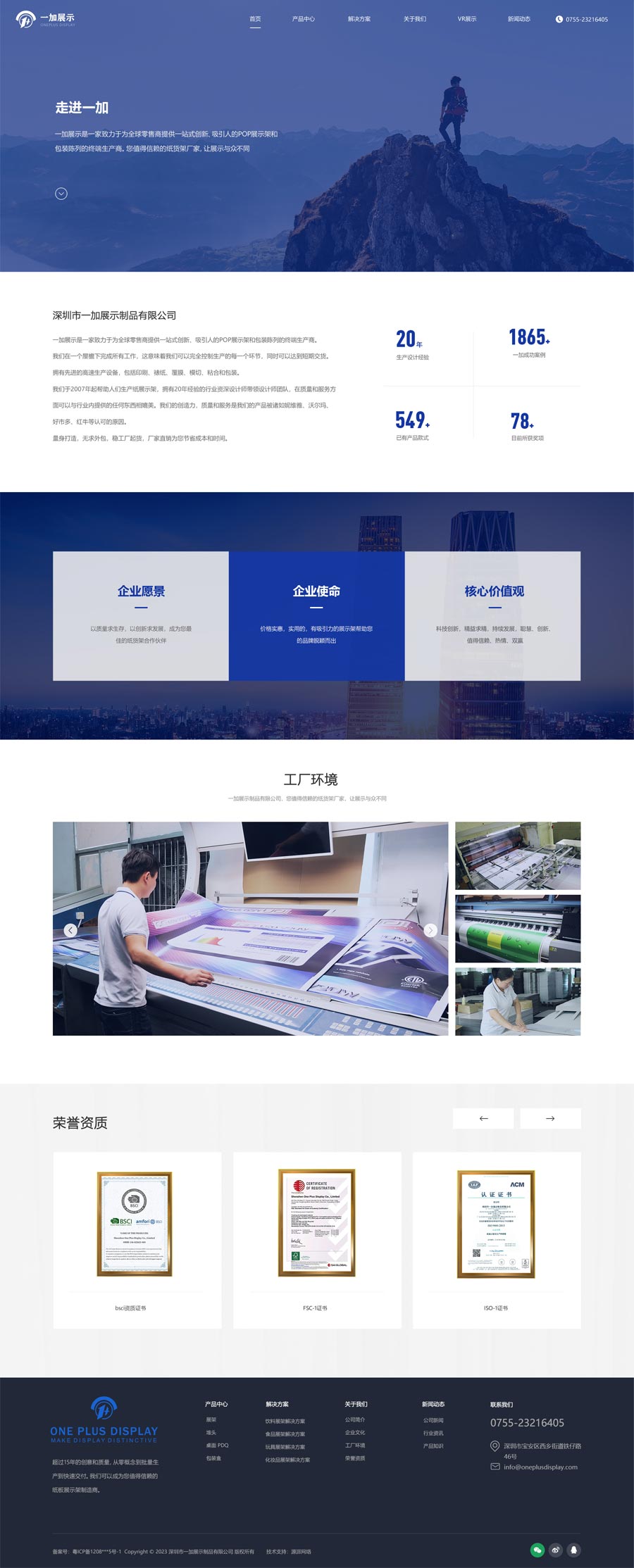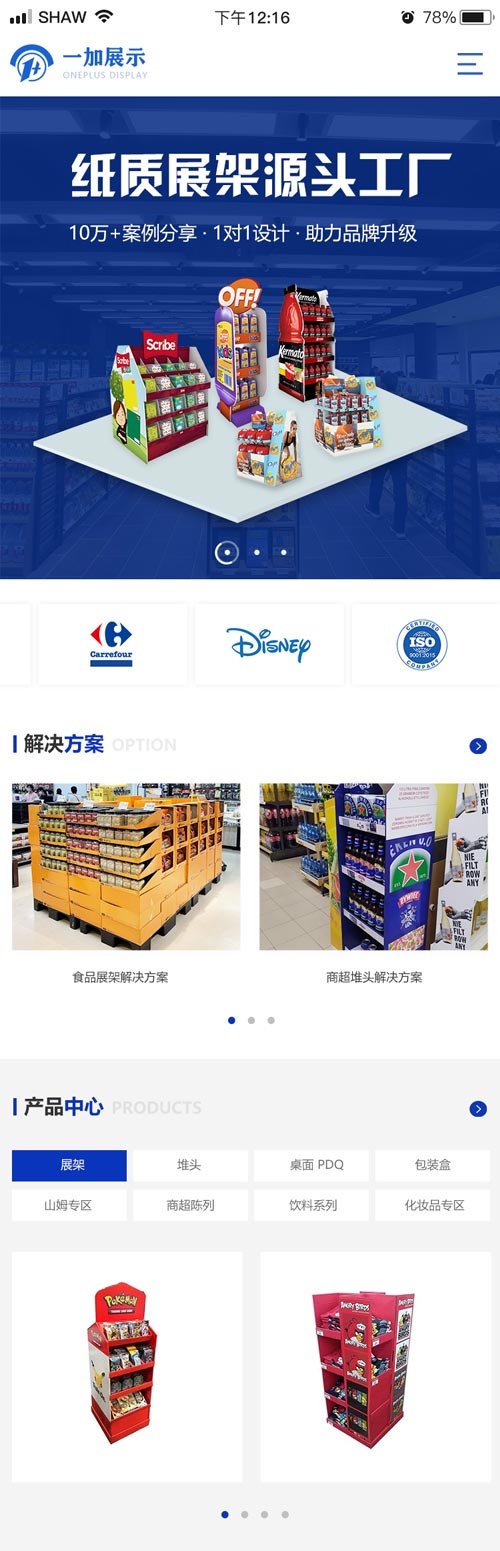 項(xiàng)目背景一加展示是一家致力于為全球零售商提供一站式POP展示架和包裝陳列的終端生產(chǎn)商?;谝患悠髽I(yè)對(duì)網(wǎng)站的需求定位主要以提升品牌形象加強(qiáng)營(yíng)銷(xiāo)力為主,展開(kāi)對(duì)展示架網(wǎng)站建設(shè)整站的策劃設(shè)計(jì)。