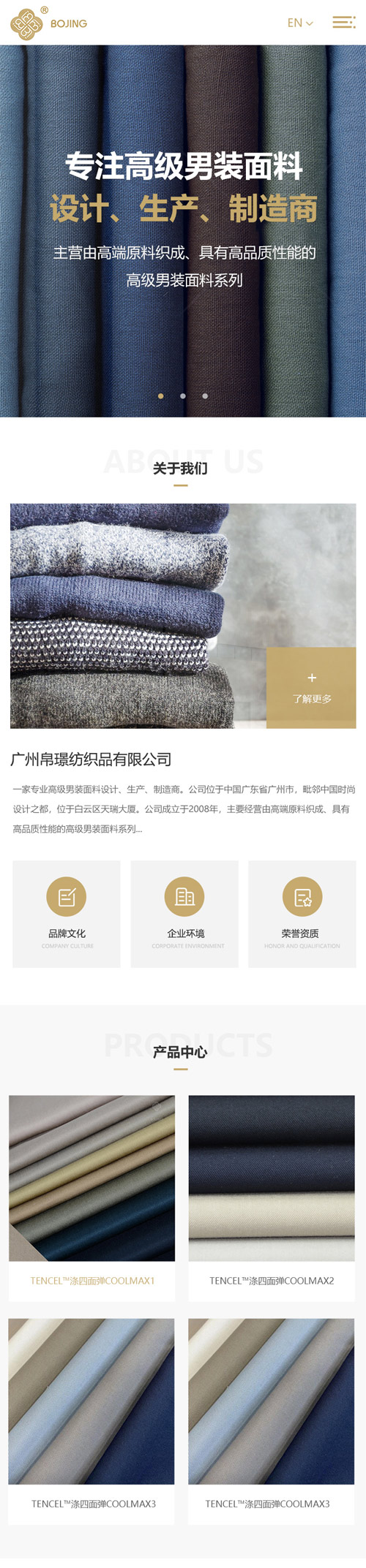 項目背景一家專業(yè)高級男裝面料設(shè)計、生產(chǎn)、制造商,公司成立于2008年整個產(chǎn)業(yè)鏈員工超過3000人,基于帛璟以品牌展示為建站目標,主要以提升品牌形象展示企業(yè)產(chǎn)品為主,圍繞紡織品網(wǎng)站設(shè)計行業(yè)屬性展開整站的策劃設(shè)計。