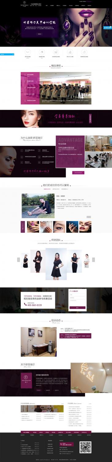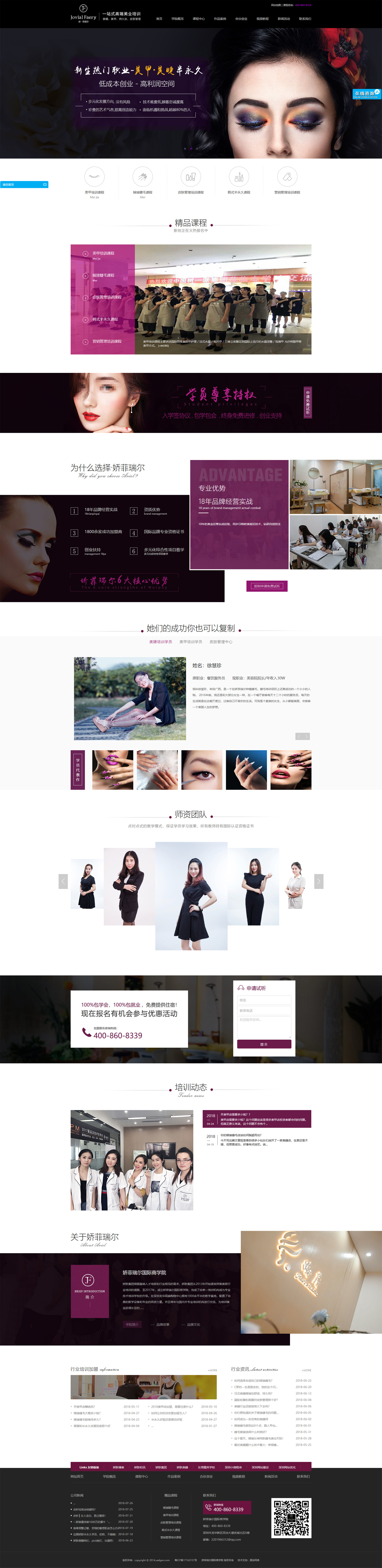 結(jié)合嬌菲瑞爾的logo元素及美業(yè)培訓(xùn)的行業(yè)屬性,將網(wǎng)站主色調(diào)定位紫色,將黑色作為輔助色,網(wǎng)站整體風(fēng)格保持著時尚簡約的風(fēng)格